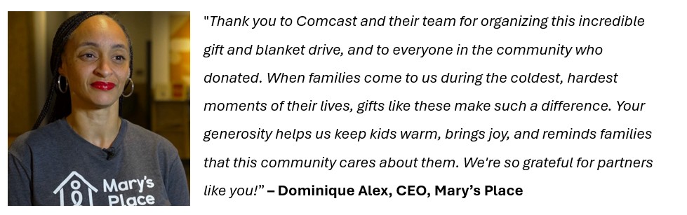 - Offering warmth, dignity, and hope with more than 1,200 Winter coats, hats, gloves, scarves, warm clothing, toys and more collected at Xfinity Retail Stores and 650 blankets crafted by employees for donation to families in need at Mary’s Place in Seattle, Family Promise in Spokane and Sheltering Silverton in Oregon.